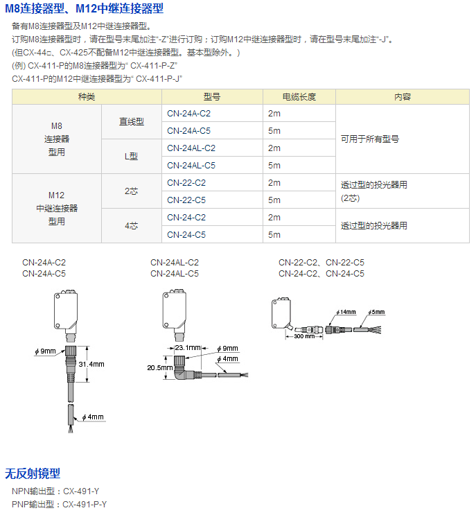 備有M8連接器型和M12中繼連接器型。有助于減少安裝、維護(hù)工時(shí)。此外,電纜型的電纜長(zhǎng)度備有0.5m、2m和5m型。不會(huì)出現(xiàn)多余的廢棄物。
