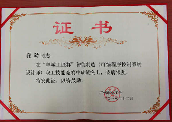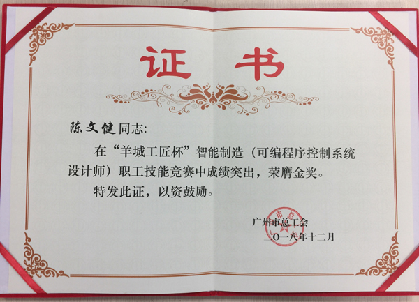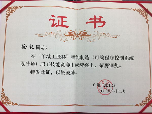為提升我司技術(shù)人員實(shí)踐操作能力,我司員工積極參加18年12月15-16日由廣州市總工會(huì)舉辦的首屆“羊城工匠杯”智能制造(可編程序控制系統(tǒng)設(shè)計(jì)師)職工技能競(jìng)賽。分別榮獲金銀銅,優(yōu)秀組織獎(jiǎng)四個(gè)獎(jiǎng)項(xiàng)。
